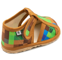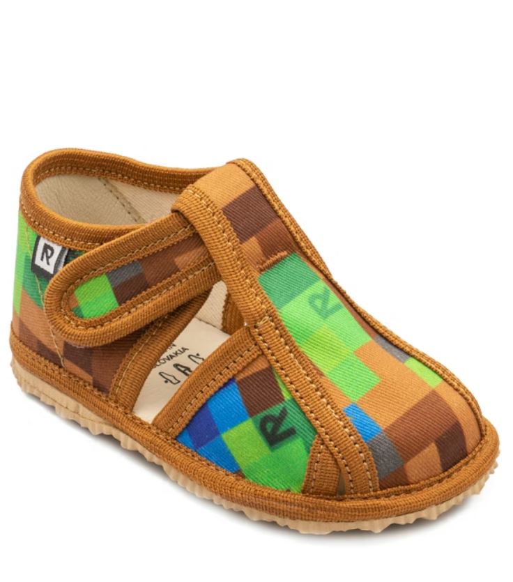 Papučky Rak sú z poctivej slovenskej dielne. Vyrábajú sa v rôznorodých farebných prevedeniach. Daný model je sandálkového strihu so zatvorenou špicou so zapínaním na suchý zips, takže sa pekne prispôsobia členkom. Tvar špičky s dôrazom na typicky detský dominantný palček zabezpečuje dostatočný priestor pre prsty. Papučky sedia na širšie nôžky aj s vyšším priehlavkom. Elastická stielka zvyšujúca komfort pri chôdzi je z kombinácie „pamäťovej“ peny a prírodnej podšívkovej ECO kože. Podrážka je pružná, ohybná, z materiálu na báze prírodného kaučuku s výrazným protišmykovým efektom aj na hladkých a lesklých povrchoch. Vďaka svojej pružnosti ich možno považovať za alternatívu barefootových papučiek.