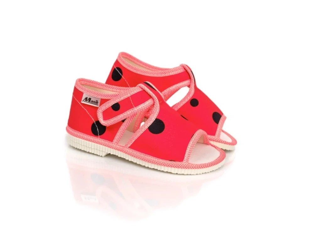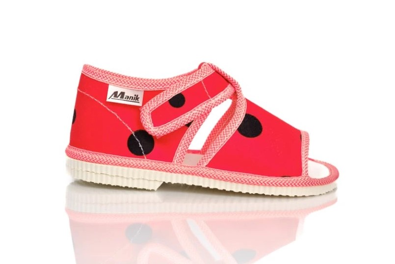 Papučky Manik sú z poctivej slovenskej dielne. Vyrábajú sa v rôznych farebných kombináciách a prevedeniach. Papučky sú sandálkového strihu s otvorenou špicou so zapínaním na suchý zips, takže sa pekne prispôsobia členkom. Sedia na normálne široké až užšie nôžky. Papučky sú ľahučké, majú výraznejšie tvarovanú klenbu a vďaka pevnejšej látke krásne detičkám sedia.
