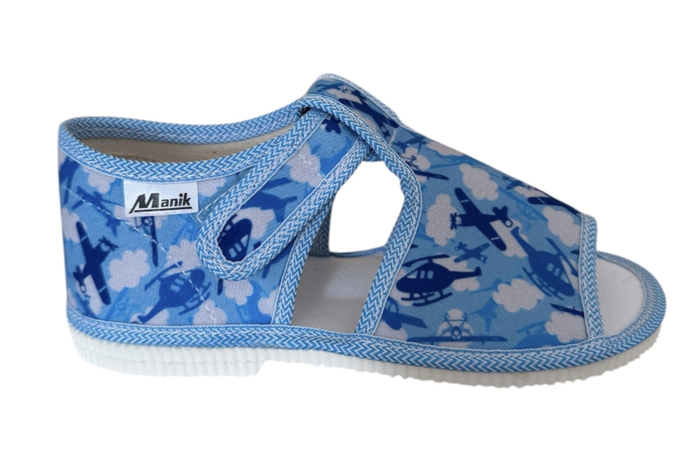 Papučky Manik sú z poctivej slovenskej dielne. Vyrábajú sa v rôznych farebných kombináciách a prevedeniach. Papučky sú sandálkového strihu s otvorenou špicou so zapínaním na suchý zips, takže sa pekne prispôsobia členkom. Sedia na normálne široké až užšie nôžky. Papučky sú ľahučké, majú výraznejšie tvarovanú klenbu a vďaka pevnejšej látke krásne detičkám sedia.