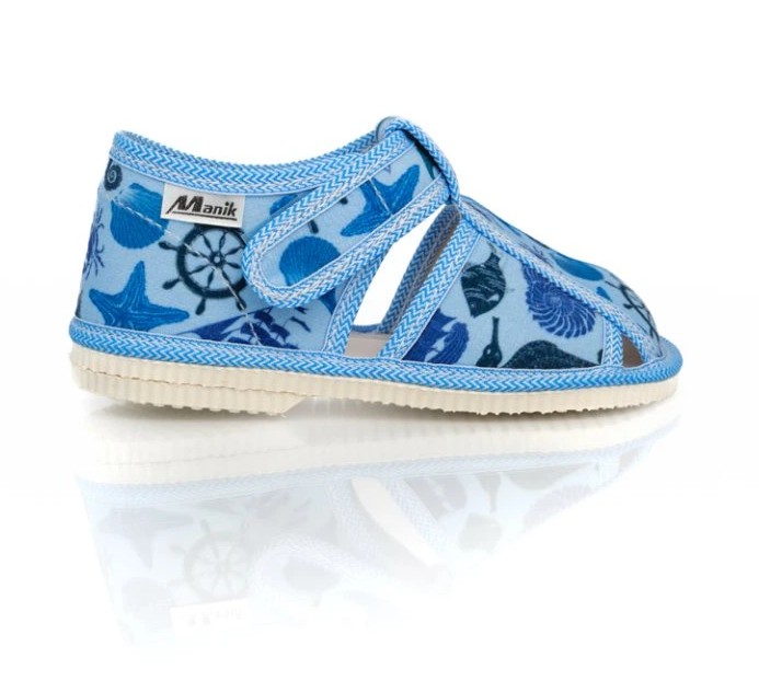 Papučky Manik sú z poctivej slovenskej dielne. Vyrábajú sa v rôznych farebných kombináciách a prevedeniach. Papučky sú sandálkového strihu so zatvorenou špicou so zapínaním na suchý zips, takže sa pekne prispôsobia členkom. Sedia na normálne široké až užšie nôžky. Papučky sú ľahučké a vďaka pevnejšej látke krásne detičkám sedia.