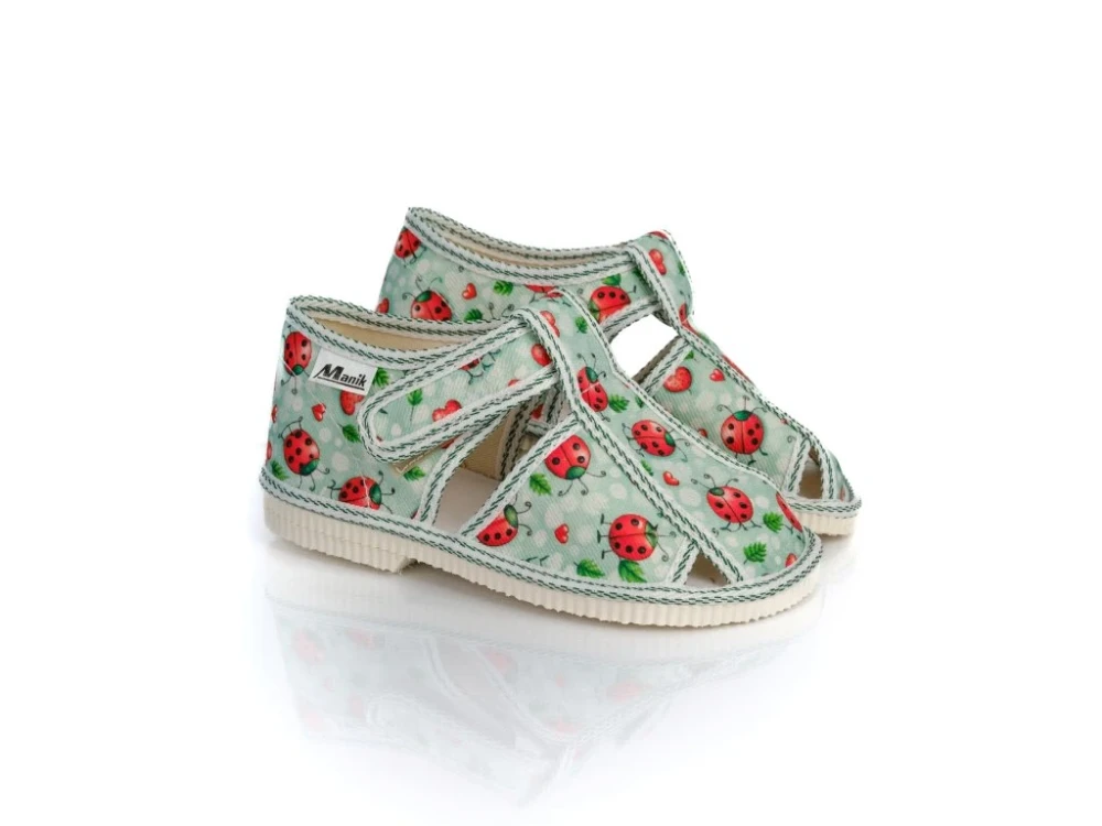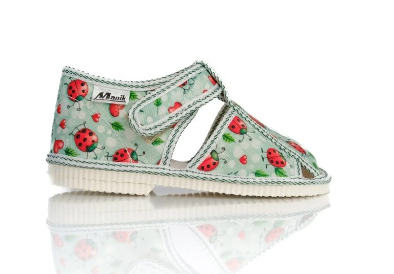 Papučky Manik sú z poctivej slovenskej dielne. Vyrábajú sa v rôznych farebných kombináciách a prevedeniach. Papučky sú sandálkového strihu so zatvorenou špicou so zapínaním na suchý zips, takže sa pekne prispôsobia členkom. Sedia na normálne široké až užšie nôžky. Papučky sú ľahučké a vďaka pevnejšej látke krásne detičkám sedia.